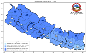 मधेश प्रदेश तथा पूर्वी तराईका झापा लगायत केही जिल्लाबाहेक देशका अधिकांश स्थानमा हल्का वर्षाको सम्भावना रहेको विभागले जनाएको छ। पूर्वी पहाडी जिल्लाका हिमाली भेगमा भने वर्षासँगै हिमपातको पनि सम्भावना छ। मनाङ, मुस्ताङसहित हिमाली क्षेत्रमा मध्यम खालको हिमपात हुने पूर्वानुमान गरिएको छ।